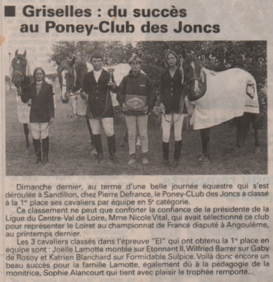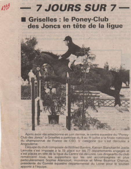 En 1999 : Nous avions participé à la finale nationale du Championnat de France de CSO, 5e catégorie par équipe qui s’était déroulée à Angoulème. Nous nous étions imposés à la 15e place sur les 77 départements engagés et placé à la tête de la ligue du Centre Val-de-Loire. Puis, à Sandillon, toujours en équipe en 5e catégorie, nous nous étions classés à la 1ère place.